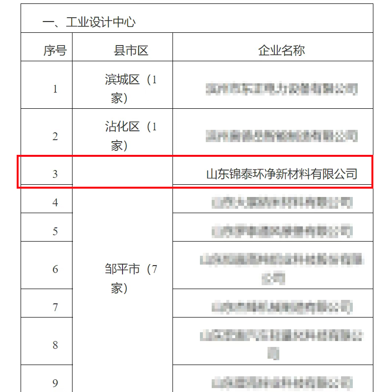 近日,濱州市工信局公示了2025年市級工業設計中心(xīn)名單,全市共28家企業入選。其中,鄒平市7家企業成功入選(xuǎn),山東錦泰環淨新材料(liào)有限公司為其中之一。···